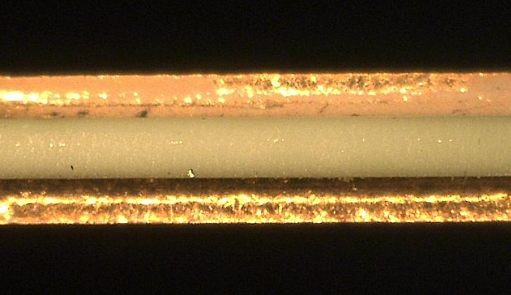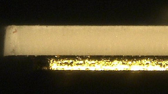 Ceramics made of aluminium oxide (see picture) can be cut technically clean at high speed even in material thicknesses of several hundred micrometers. Low (LTCC) and high (HTCC) fired ceramics can be both processed.