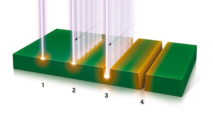 In case of laser depaneling, the thermal energy of the laser is used to remove the material path by path / layer by layer. With each repitition, a pre-defined thickness of the material is ablated and vaporised. The resulting fumes are extracted during the process by a powerful suction system. Due to the small particles and the powerful suction, the deposition of residues is reduced to a minimum. In addition, the thermal energy is regulated during the entire process in such a way that, depending on the specific requirements, there is no or only very little carbonisation of the material.